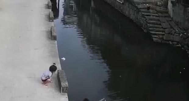 Εικόνες από κάμερα ασφαλείας δείχνουν δύο κορίτσια να παίζουν δίπλα στο ποταμό Shaoxing, στην Κίνα. Ένα από τα μικρά παιδιά πέφτει μέσα στο νερό και προσπαθεί να επιπλεύσει με δυσκολία.