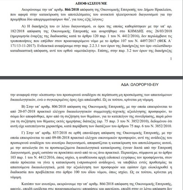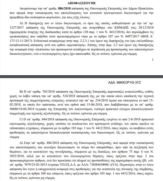 Στην ακύρωση δυο διαγωνισμών του δήμου Ηρακλείου προχώρησε η Αποκεντρωμένη Διοίκηση Κρήτης, καθώς δεν τηρήθηκαν οι όροι της νομοθεσίας, ενώ σε έναν από τους δυο έγινε επίκληση… απόφασης που δεν υπάρχει! Οι διαγωνισμοί αφορούσαν στην προμήθεια δυο απορριμματοφόρων και δυο εκσκαφέων, αλλά φαίνεται ότι όλα έγιναν τόσο πρόχειρα ώστε οι αρμόδιοι δεν πήραν χαμπάρι ούτε τις αλλαγές στη νομοθεσία ούτε όμως και αποφάσεις που είχαν ανακληθεί!