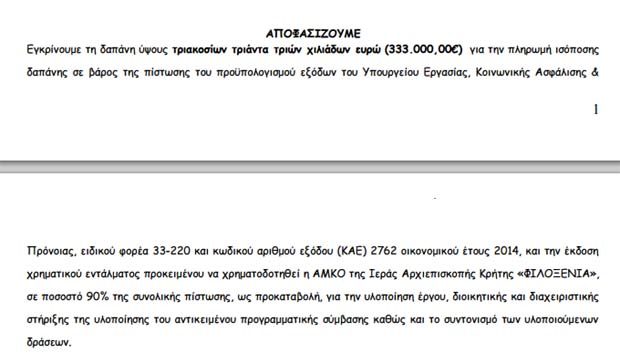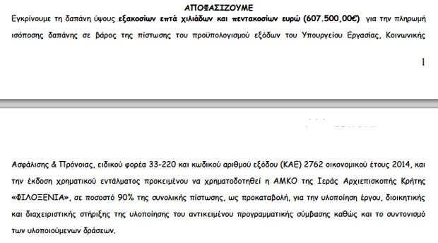 Στις 2 Δεκεμβρίου χορηγούσε, με βάση την προγραμματική σύμβαση, 607.500 ευρώ στην ΜΚΟ της Εκκλησίας Κρήτης.