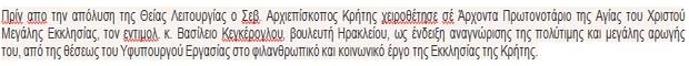 Ἡ Ἐκκλησία Κρήτης ἐκφράζει βαθύτατες εὐχαριστίες πρός τόν κ. Βασίλειο Κεγκέρογλου, Ὑφυπουργό Ἐργασίας, Κοινωνικῆς Ἀσφάλισης καί Πρόνοιας, ὁ ὁποῖος εἶχε τήν εὐγενῆ πρωτοβουλία, ἐξασφάλισε καί ὑπέγραψε τίς παραπάνω Συμβάσεις, πού θά συμβάλουν καθοριστικά στήν ἐνδυνάμωση καί στήν ἐπαύξηση τοῦ φιλανθρωπικοῦ ἔργου τῆς Ἐκκλησίας, πρός ὄφελος τοῦ Λαοῦ, κατά τούς δύσκολους καιρούς πού διανύει ἡ Χώρα μας”.