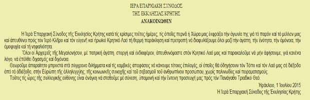 “Ἡ Ἱερά Ἐπαρχιακή Σύνοδος τῆς Ἐκκλησίας Κρήτης κατά τίς κρίσιμες τοῦτες ἡμέρες, τίς ὁποῖες περνᾶ ἡ Χώρα μας ἐκφράζει τήν ἀγωνία της γιά τό παρόν καί τό μέλλον μας καί ἀπευθύνει πρός τόν Ἱερό Κλῆρο καί τόν εὐγενῆ καί ἡρωϊκό Κρητικό Λαό τή θερμή παράκληση καί προτροπή νά διαφυλάξουμε ὅλοι μαζί τήν ἀγάπη, τήν ἑνότητα, τήν ὁμόνοια, τήν ὁμοψυχία καί τή νηφαλιότητα.