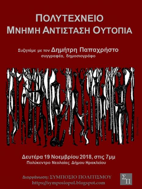 Το ‘Συμπόσιο Πολιτισμού’, πραγματοποιεί εκδήλωση με θέμα : “Πολυτεχνείο, Μνήμη, Αντίσταση Ουτοπία”, στο Πολύκεντρο Νεολαίας του Δήμου Ηρακλείου την προσεχή Δευτέρα 19 Νοεμβρίου στις 7 το βράδυ.