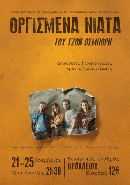 Το Θεατροδρόμιο σε συνεργασία με τους Stavaganti NUOVI, παρουσιάζουν το Θεατρικό έργο του John Osborn “Οργισμένα νιάτα”, από τις 21 έως και τις 25 Νοεμβρίου στον θεατρικό σταθμό Ηρακλείου και ώρα 21:30.