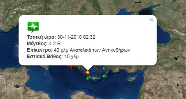 Όπως αναφέρουν τα στοιχεία του seismoi-live.gr, η σεισμική δόνηση σημειώθηκε στις 2.32 τη νύχτα, 40 χλμ ανατολικά των Αντικυθήρων.