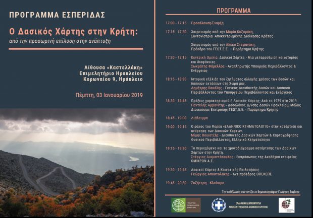 Η Αποκεντρωμένη Διοίκηση Κρήτης, σε συνεργασία με το Γεωτεχνικό Επιμελητήριο Ελλάδος-Παράρτημα Κρήτης, διοργανώνει εσπερίδα με θέμα “Ο Δασικός χάρτης στην Κρήτη: από την προσωρινή επίλυση στην ανάπτυξη” την Πέμπτη 3 Ιανουαρίου 2019 και ώρα 17:00 στην αίθουσα «Καστελλάκη» του Επιμελητηρίου Ηρακλείου.