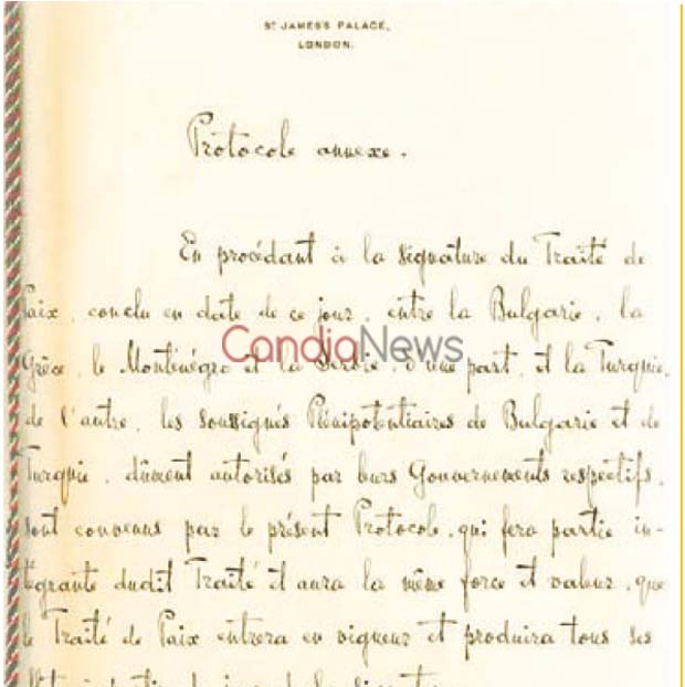 Ανάμεσα στ’ άλλα γινόταν η αναφορά ότι η Βουλγαρία παραιτείται από κάθε δικαίωμα επί της Κρήτης. Γινόταν αναφορά μόνο στη Βουλγαρία, καθώς για τις άλλες βαλκανικές δυνάμεις, στις οποίες είχε εκχωρηθεί η Κρήτη από το σουλτάνο με τη συμφωνία του Λονδίνου, δεν υπήρχε θέμα δήλωσης παραίτησης, αφού δεν είχαν ποτέ καμιά εδαφική διεκδίκηση στην Ελλάδα.