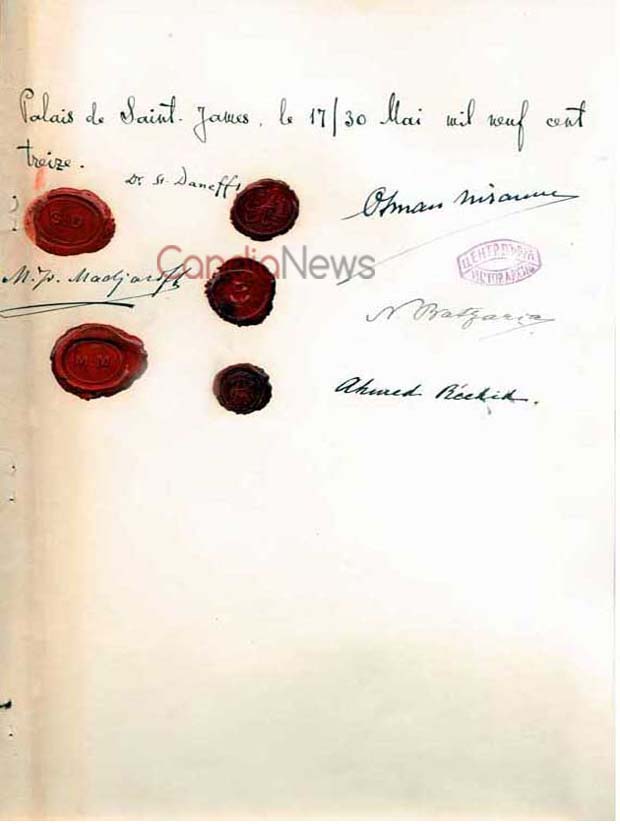 Το χειρόγραφο της Συμφωνίας του Λονδίνου, που υπεγράφη ανάμεσα στις βαλκανικές χώρες, στις 30 Μαΐου 1913. Από κάτω οι υπογραφές των αντιπροσώπων τους τους, που σφραγίζονται με βουλοκέρι. Το κείμενο υπάρχει στα αρχεία υπουργείου Εξωτερικών της Βουλγαρίας