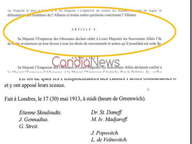 Η αναφορά στο άρθρο 4 της συμφωνία του Λονδίνου ήταν απλή και ξεκάθαρη: “Ο Σουλτάνος παραιτείται απ’ όλα όσα κατείχε επί της νήσου Κρήτης και εκχωρεί στην εύνοια των συμμάχων ηγεμόνων όλα τα δικαιώματα της κυριαρχίας και όλα τα άλλα δικαιώματα που κατείχε σε εκείνη τη νήσο”.