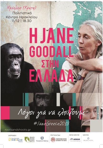 Tο Μουσείο Φυσικής Ιστορίας Κρήτης – Πανεπιστήμιο Κρήτης, η Περιφέρεια Κρήτης και το Jane Goodall Roots & Shoots Greece ανακοινώνουν την επίσκεψη της διεθνούς φήμης πρωτευοντολόγου, ηθολόγου και Πρέσβειρας Ειρήνης των Ηνωμένων Εθνών Dr. Jane Goodall στο Ηράκλειο σήμερα Τρίτη 11 Δεκεμβρίου 2018 ώρα 18:30, στην αίθουσα του Πειραματικού Θεάτρου στο Πολιτιστικό Κέντρο Ηρακλείου (Λ. Πλαστήρα).