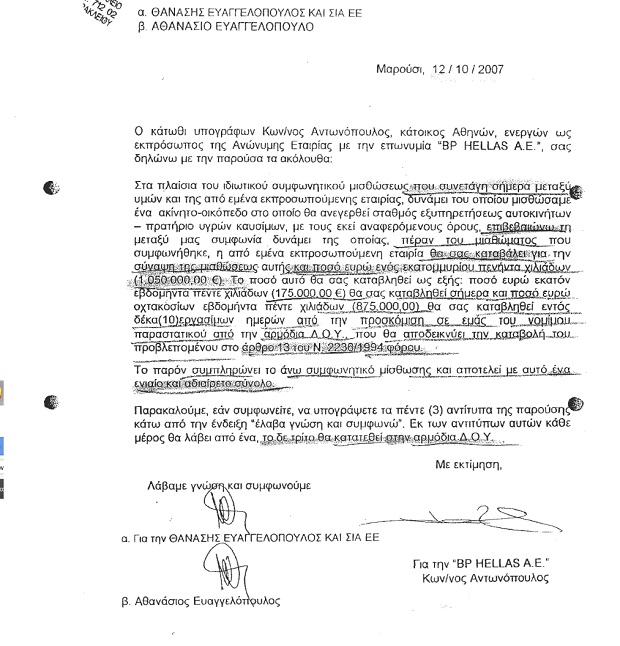 Το περίεργο είναι ότι ακριβώς την επομένη ο επιχειρηματίας – ενοικιαστής υπογράφει συμβόλαιο στην Αθήνα με την BP HELLAS για την υπομίσθωση της έκτασης ώστε να αναπτυχθεί το πρατήριο καυσίμων, δραστηριότητα που στο συγκεκριμένο σημείο δεν είναι συμβατή με τις χρήσεις που ορίζει το σχέδιο. Μπορούμε να συμπεράνουμε ότι οι ριζικές αλλαγές θα πρέπει να ήταν σε γνώση του καιρό πριν ότι το αίτημά του είχε γίνει δεκτό, κι όχι την προηγούμενη ημέρα που το κατέθεσε και του δόθηκε η αυθημερόν θετική απάντηση…