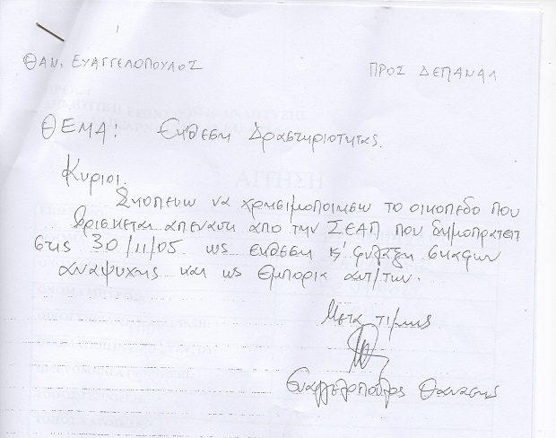 Ο επιχειρηματίας Θανάσης Ευαγγελόπουλος (συνιδιοκτήτης του πρατηρίου υγρών καυσίμων που λειτουργεί σήμερα στον χώρο αυτό, απέναντι από τη ΣΕΑΠ), πριν τον διαγωνισμό, στέλνει στη ΔΕΠΑΝΑΛ μια ιδιόχειρη επιστολή στην οποία αναφέρει ότι σκοπεύει να χρησιμοποιήσει την έκταση “ως έκθεση και φύλαξη σκαφών αναψυχής και ως εμπορία αυτοκινήτων”, δραστηριότητα προφανώς συμβατή στη συγκεκριμένη θέση.