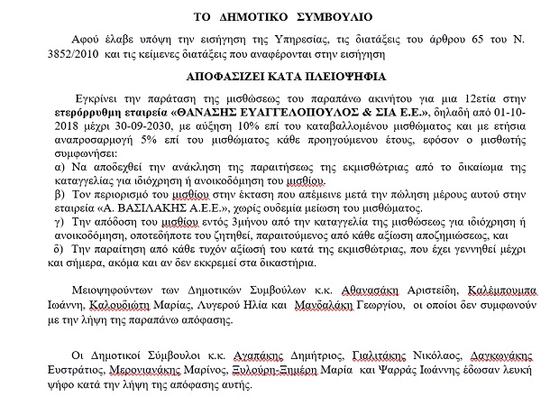 Ναι, δεν είναι χάριν γούστου η αναφορά… Το δημοτικό συμβούλιο Ηρακλείου της 12ης Νοεμβρίου δέχτηκε κατά πλειοψηφία ότι “ενόψει και της ωφέλειας που παρέχει η προκειμένη μίσθωση στη ΔΕΠΑΝΑΛ Α.Ε. και του γεγονότος ότι δεν διαφαίνεται άλλη άμεση αξιοποίησή του είτε από τη Δημοτική εταιρεία είτε από τον Δήμο”, την “παράταση της μισθώσεως για μια 12ετία, από 01-10-2018 μέχρι 30-09-2030”!