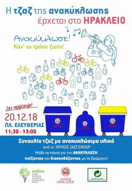 Σε συνεργασία με την Ελληνική Εταιρεία Αξιοποίησης Ανακύκλωσης – Ε.Ε.Α.Α. , έρχεται για πρώτη φορά στο Ηράκλειο η «Τζαζ της Ανακύκλωσης» από τουςVoyage Jazz Group, μια μπάντα με μουσικά όργανα φτιαγμένα από ανακυκλώσιμα υλικά, για μια μοναδική συναυλία στην καρδιά της πόλης. Η συμμετοχή φυσικά και είναι ελεύθερη για μικρούς και μεγάλους οι οποίοι θα μπορέσουν να απολαύσουν μια παράσταση η οποία περιέχει στοιχεία διαδραστικής ρυθμολογίας, μια απλή ευχάριστη μουσικο-σωματική άσκηση με ρυθμο-κινητικά παιχνίδια και χορό, γνωστές μουσικές επιτυχίες με στίχους για την ανακύκλωση, ενώ και οι θεατές μπορούν να συμμετέχουν με αυτοσχέδια όργανα από συσκευασίες, μαθαίνοντας με αυτό τον τρόπο ποιες συσκευασίες ανακυκλώνονται.