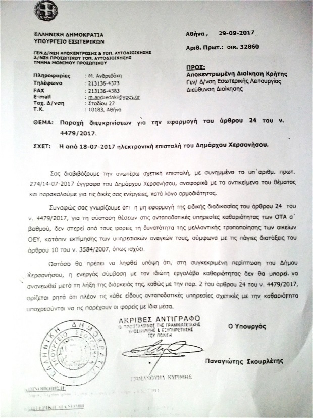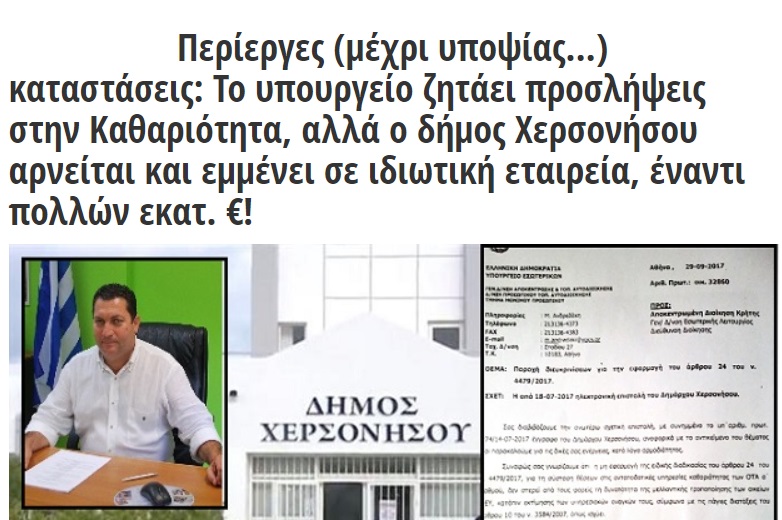 Μάλιστα ο πρώην υπουργός Εσωτερικών, Πάνος Σκουρλέτης, είχε αναφέρει σε έγγραφο της 29ης Σεπτεμβρίου 2017 την περίπτωση του δήμου Χερσονήσου, κάνοντας σαφές ότι “στη συγκεκριμένη περίπτωση του Δήμου Χερσονήσου, η ενεργός σύμβαση με τον ιδιώτη εργολάβο καθαριότητας δεν θα μπορεί να ανανεωθεί μετά τη λήξη της διάρκειας της, καθώς με την παρ. του άρθρου 24 του ν. 4479/2017 ορίζεται ρητά ότι πλέον τις κάθε είδους ανταποδοτικές υπηρεσίες σχετικές με την καθαριότητα υποχρεούνται να τις παρέχουν οι φορείς με ίδια μέσα”.
