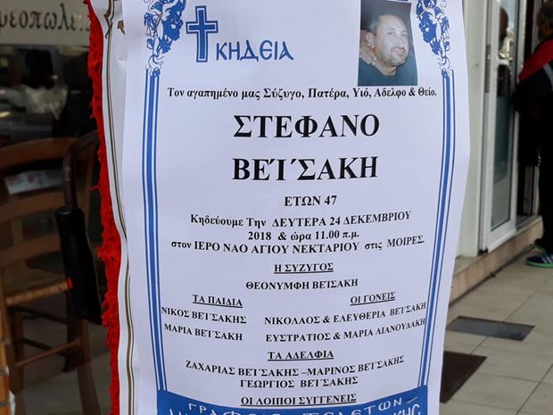 Πρόκειται για τον 41χρονο Στέφανο Βεϊσάκη, ο οποίος έφυγε από τη ζωή τη νύχτα προδομένος από την καρδιά του, καθώς σύμφωνα με την τοπική σελίδα Δια-SOS-τε τη Μεσαρά, υπέστη ανεύρυσμα αορτής.