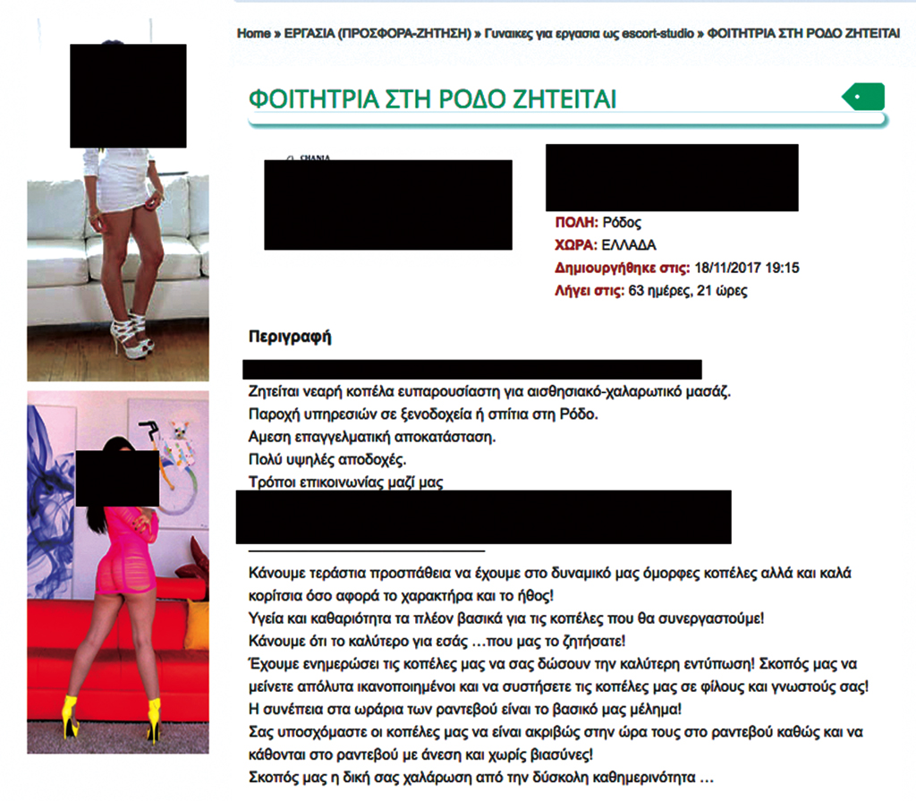 Από τα μέσα του Οκτωβρίου 2017, έκανε την εμφάνισή της στο διαδίκτυο, αγγελία εταιρείας, που φέρεται να λειτουργεί στην Κρήτη, με την επωνυμία cretegirlsnetwork και με κινητό τηλέφωνο επικοινωνίας, με την οποία ζητείται προς πρόσληση «νεαρή κοπέλα ευπαρουσίαστη για αισθησιακό-χαλαρωτικό μασάζ» για παροχή υπηρεσιών σε ξενοδοχεία ή σπίτια στη Ρόδο.