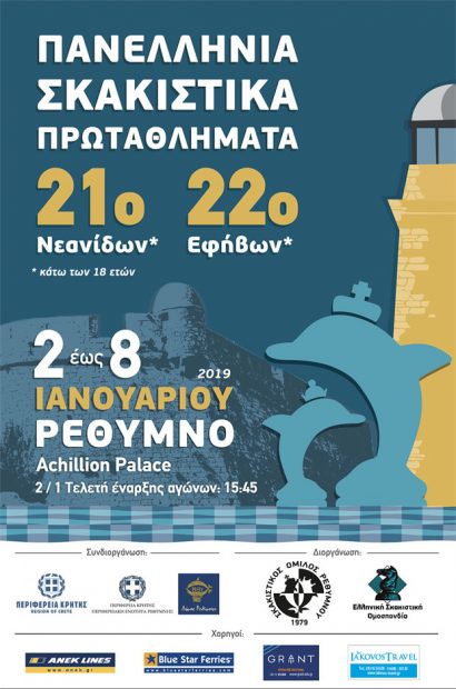 Το Ρέθυμνο φιλοξενεί το 22ο Πανελλήνιο Ατομικό Πρωτάθλημα Εφήβων και 21ο Πανελλήνιο Ατομικό Πρωτάθλημα Νεανίδων σκάκι 2019. Οι αγώνες θα πραγματοποιηθούν από 2 έως 8 Ιανουαρίου 2019 στο Ρέθυμνο, στην αίθουσα του ξενοδοχείου “Αχίλλειον Παλλάς” με διοργανωτές τον Σκακιστικό Όμιλο Ρεθύμνου και συν-διοργανωτές την Ελληνική Σκακιστική Ομοσπονδία, τον Δήμο Ρεθύμνου, την Περιφέρεια Κρήτης, την Περιφερειακή Ενότητα Ρεθύμνου και χορηγούς την ΑΝΕΚ Lines και Blue Star Ferries.