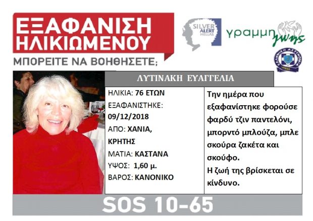 Η μία εξαφάνιση είναι αυτή της Ευαγγελία Λυτινάκη από τα Χανιά. Η 76χρονη γυναίκα, όπως αναφέρεται και στο σήμα του silver alert που έχει εκδοθεί, εξαφανίστηκε στις 9 Δεκεμβρίου όταν για τελευταία φορά εθεάθη στο 7ο χιλιόμετρο της παλιάς Εθνικής Οδού Χανίων – Κισσάμου