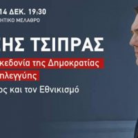 Ο πρόεδρος του ΣΥΡΙΖΑ και πρωθυπουργός Αλέξης Τσίπρας θα μιλήσει σήμερα, Παρασκευή 14 Δεκεμβρίου, στην πολιτική συγκέντρωση του ΣΥΡΙΖΑ στη Θεσσαλονίκη στο Αλεξάνδρειο Αθλητικό Μέλαθρο στις 19.30. Η Θεσσαλονίκη λέει «ναι» στη δημοκρατία και όχι στον εθνικισμό και το διχασμό, είναι το μήνυμα που θέλει να στείλει ο ΣΥΡΙΖΑ με αυτή τη συγκέντρωση.