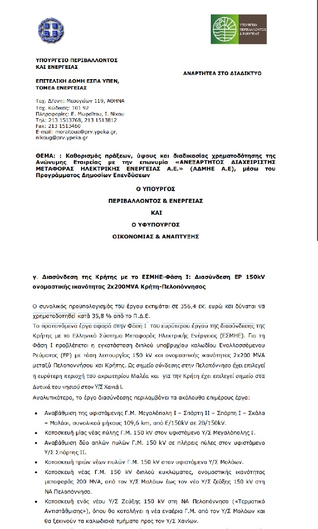 Κρήτης με το Ελληνικό Σύστημα Μεταφοράς Ηλεκτρικής Ενέργειας (ΕΣΜΗΕ). Για τη