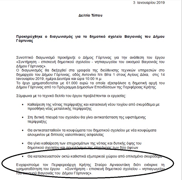 Μα τί έπαθε ξαφνικά ο δήμαρχος Γόρτυνας, Νίκος Σχοιναράκης; Αποφάσισε να κάνει όλη… την ανάπλαση του δήμου του (που δεν είχε κάνει επί χρόνια) σε μερικές μέρες (ξεκινώντας προφανώς την προεκλογική του εκστρατεία) αλλά και να ευχαριστεί και να… προσεύχεται καθημερινά υπέρ υγείας του μακαριωτάτου… περιφερειάρχη Κρήτης, Σταύρο Αρναουτάκη, που του δίνει χρήματα για αναπλάσεις σε πλατείες και μοναστήρια!