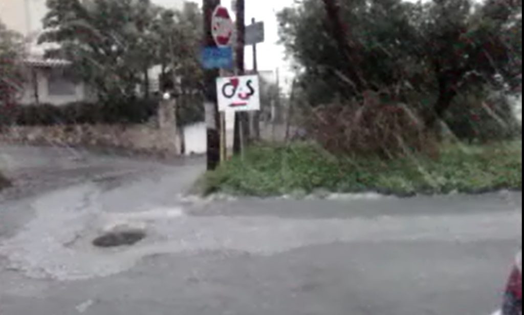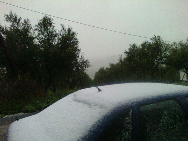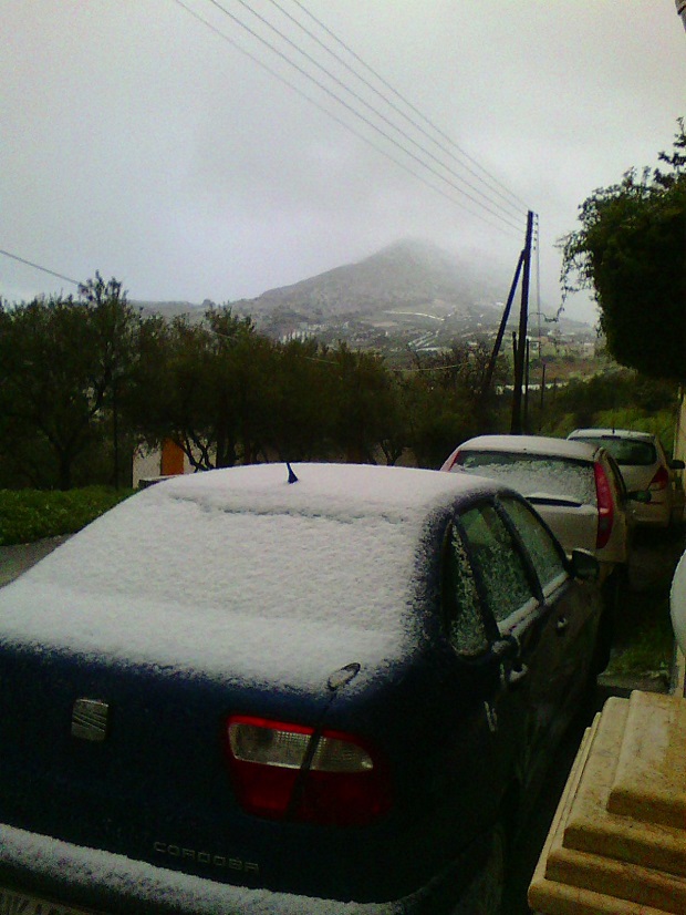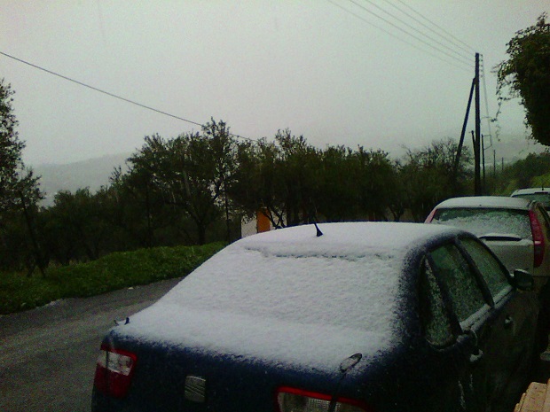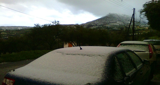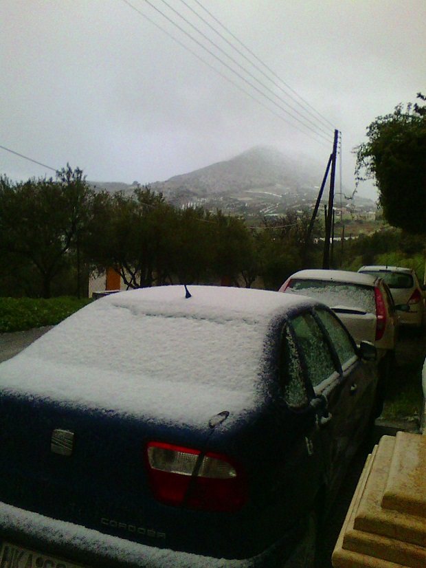 Πυκνή χιονόπτωση πριν από λίγο στην περιοχή των Βασιλειών, λίγο έξω από το Ηράκλειο.