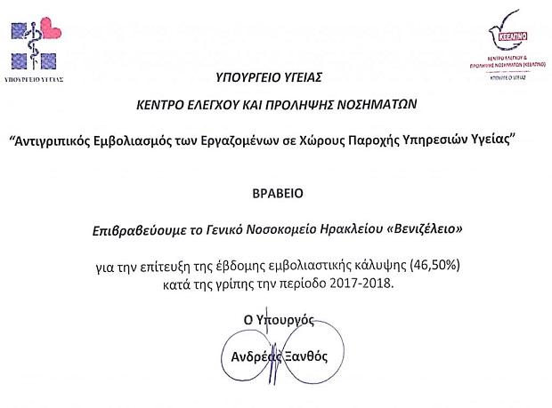 Το Βενιζέλειο νοσοκομείο, για το έτος 2017-2018, πήρε πανελλήνιο βραβείο, από το Υπουργείο Υγείας, για την εμβολιαστική κάλυψη των στελεχών του στον τον ιό της γρίπης, με ποσοστό 46,5% (7ο νοσοκομείο πανελλαδικά).