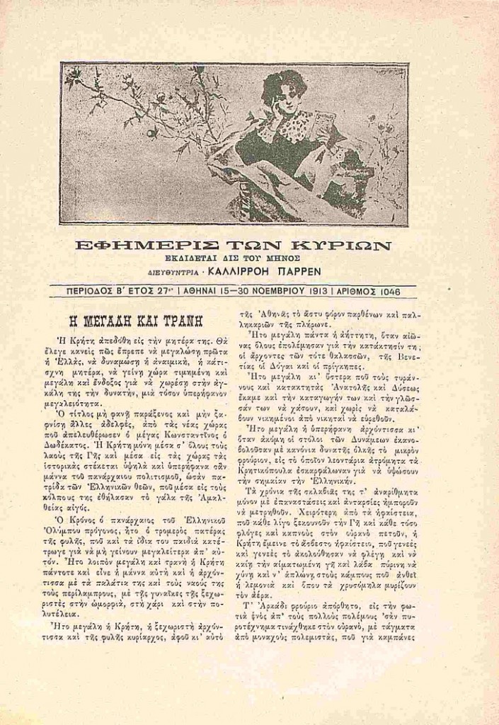 Σαν σήμερα, στις 15 Ιανουαρίου 1940, άφησε την τελευταία της πνοή μία από τις σημαντικότερες προσωπικότητες του ελληνικού φεμινισμού και η πρωτοπόρος του γυναικείου κινήματος στην Ελλάδα, Καλλιρρόη Παρρέν. Η Παρρέν διεκδικεί παράλληλα και τον τίτλο της πρώτης Ελληνίδας δημοσιογράφου και εκδότριας, εκδίδοντας το 1888 την εβδομαδιαία εφημερίδα «Εφημερίς των Κυριών», με συντάκτες και παραλήπτες αποκλειστικά τις γυναίκες.