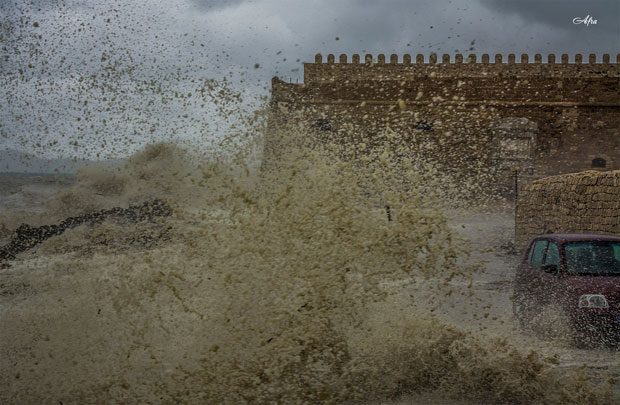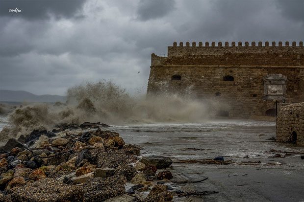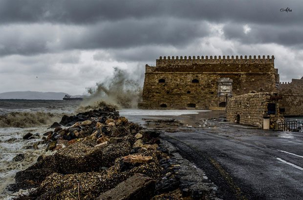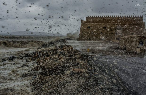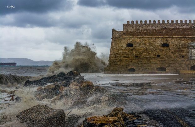 Δυνατοί άνεμοι πνέουν και στο λιμάνι του Ηρακλείου, με τον αγέρωχο Κούλε να δέχεται τα μανιασμένα κύματα.