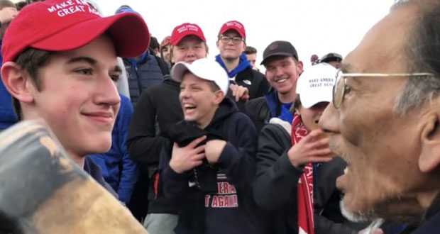 Όσο η Ελλάδα ζούσε στον πυρετό του Παμμακεδονικού συλλαλητηρίου στο Σύνταγμα, ένα στιγμιότυπο από μια άλλη πορεία στην Ουάσιγκτον έκανε το γύρο του διαδικτύου – έγινε viral όπως συνηθίζεται να λέμε. Η εικόνα-ντοκουμέντο, που βιντεοσκοπήθηκε την Παρασκευή και δημοσιοποιήθηκε το Σάββατο μιλάει από μόνη της: Ένας ηλικιωμένος αυτόχθονας Αμερικανός, όπως είναι η πιο ορθή ονομασία για όσους κάποτε αποκαλούσαμε συλλήβδην «Ινδιάνους», παίζει το τύμπανό του στωικά και τραγουδάει ένα παραδοσιακό τραγούδι, ενώ μπροστά του ένα τσούρμο ανήλικα λευκά αγόρια τον κοροϊδεύουν με υποτιμητικά ουρλιαχτά και μιμητικές κινήσεις.