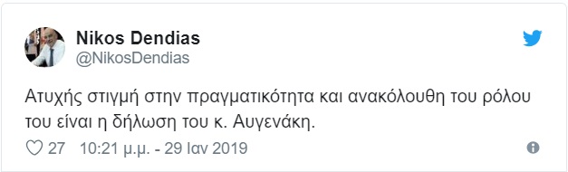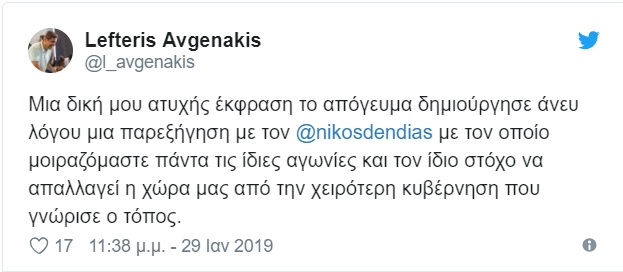 Ο γραμματέας της ΝΔ έσπευσε από την πλευρά του, πάλι μέσω twitter, να τα «μαζέψει» γράφοντας σε ανάρτησή του: «Μια δική μου ατυχής έκφραση το απόγευμα δημιούργησε άνευ λόγου μια παρεξήγηση με τον @nikosdendias με τον οποίο μοιραζόμαστε πάντα τις ίδιες αγωνίες και τον ίδιο στόχο να απαλλαγεί η χώρα μας από την χειρότερη κυβέρνηση που γνώρισε ο τόπος».