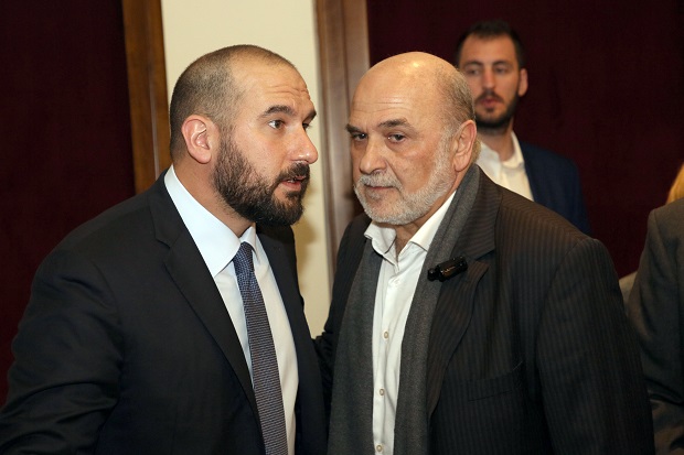 Ο υπουργός Επικρατείας, Δημήτρης Τζανακόπουλος, ανταλλάσσει χειραψία με τον άλλοτε δήμαρχο Ηρακλείου, Κώστα Ασλάνη