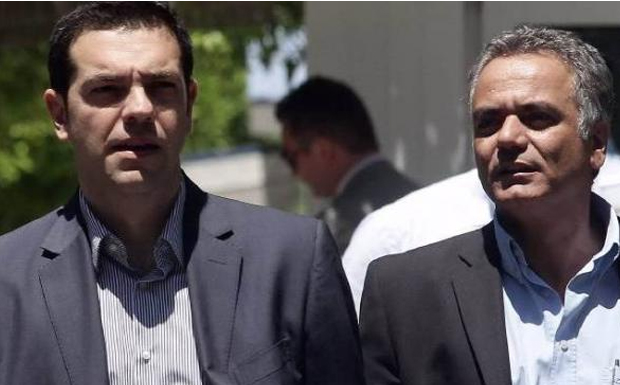 Ο υπουργός Επικρατείας, Δημήτρης Τζανακόπουλος, ανταλλάσσει χειραψία με τον άλλοτε δήμαρχο Ηρακλείου, Κώστα Ασλάνη