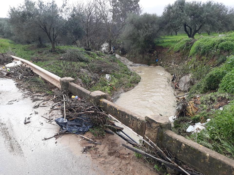 Οι μεγάλες ποσότητες νερού και τα φερτά υλικά- διάφορα μπάζα και σκουπίδια- εφραξαν το γεφυράκι του κεντρικού δρόμου με αποτέλεσμα να υπερχειλίσει το ρέμα και το νερό να υπερκαλύψει την άσφαλτο.