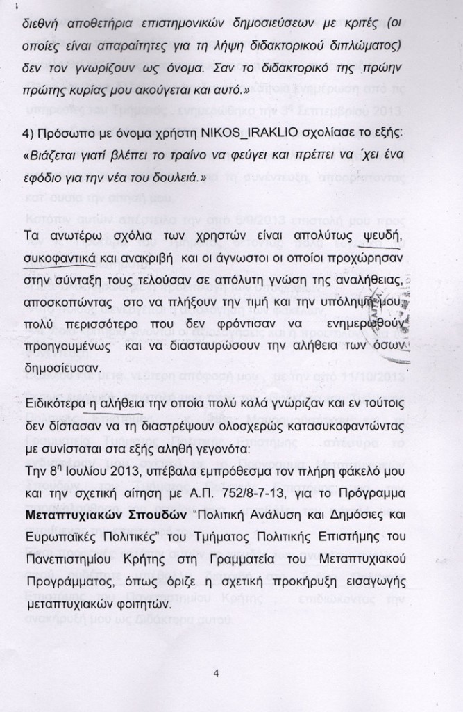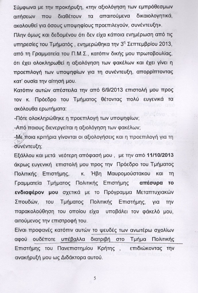 -Να του ασκήσει κριτική επειδή τα έβαλε με το Πανεπιστήμιο Κρήτης, στην υπόθεση της ανακήρυξης ως επίτιμου διδάκτορα του Γερμανού ιστορικού Χάνς Ρίχτερ, κάνοντας σχετικές επισημάνσεις σε σχόλιό του με τον τίτλο “Εκεί που πρέπει, εισαγγελείς κι ευαίσθητοι βουλευτές δεν παρεμβαίνουν…” κι επειδή αποκάλυψε ότι έστειλε οργισμένη επιστολή επίσης στο Πανεπιστήμιο, όταν δεν ανακηρύχθηκε διδάκτορας (ο ίδιος αναφέρει, ότι αφορούσε στο μεταπτυχιακό) και αναρωτήθηκε, με χιούμορ και κριτική διάθεση, αν το “κόψιμό” του σχετίζεται με την αντίδρασή του απέναντι στο ανώτατο εκπαιδευτικό ίδρυμα.
