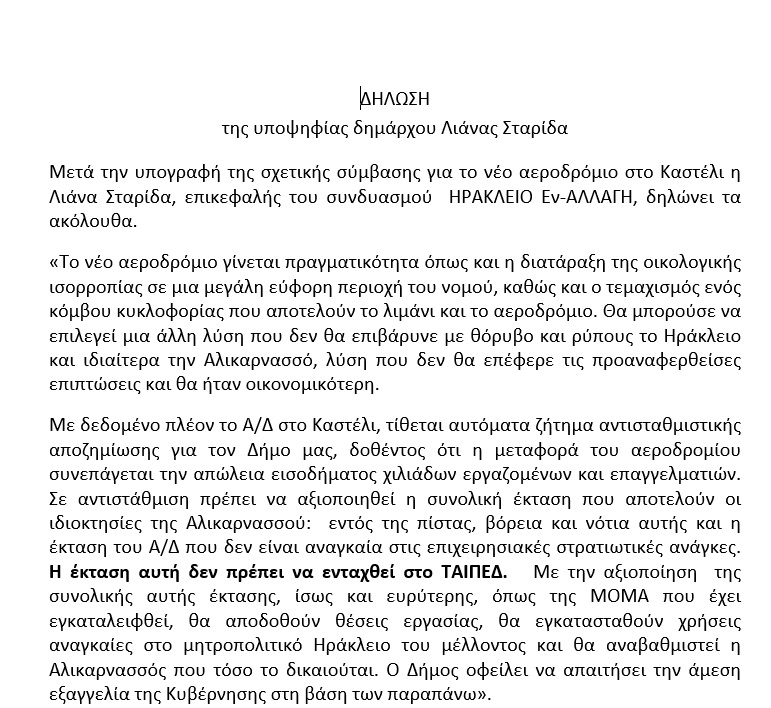 Μετά την υπογραφή της σχετικής σύμβασης για το νέο αεροδρόμιο στο Καστέλι η Λιάνα Σταρίδα, επικεφαλής του συνδυασμού ΗΡΑΚΛΕΙΟ Εν-ΑΛΛΑΓΗ, δηλώνει τα ακόλουθα.