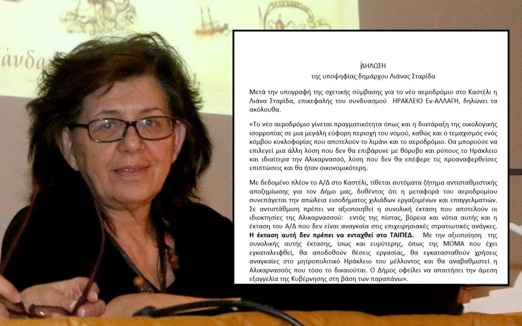 Μπορεί η κυβέρνηση του ΣΥΡΙΖΑ να προχωρεί στην υλοποίηση, ως εμβληματικού έργου για την ανάπτυξη της Κρήτης, του αεροδρομίου στο Καστέλλι, η υποψήφια όμως δήμαρχος που υποστηρίζει η πλειοψηφία της ΝΕ του κόμματος στο Ηράκλειο, Λιάνα Σταρίδα, εκφράζει τη δημόσια διαφωνία της και αντιδρά στο έργο.