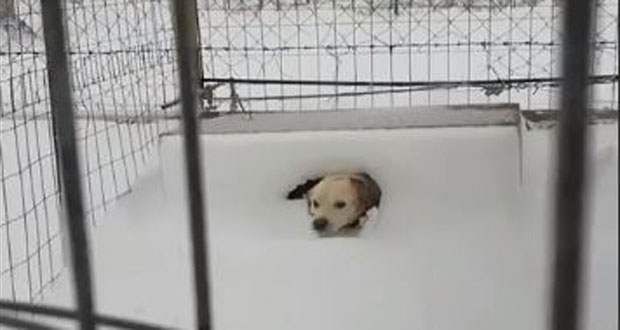 Σήμερα 23/2/2019 η Λήμνος πλήττεται από νωρίς το πρωί από σφοδρή χιονοθύελλα. Στο βίντεο που ακολουθεί μπορείτε να δείτε ένα δεσποζομενο σκυλί, εκτεθειμένο στις καιρικές συνθήκες, σε περιφραγμένο μικρό χώρο, δεμένο με μισό μέτρο αλυσίδα να έχει θαφτεί κυριολεκτικά από το χιόνι.