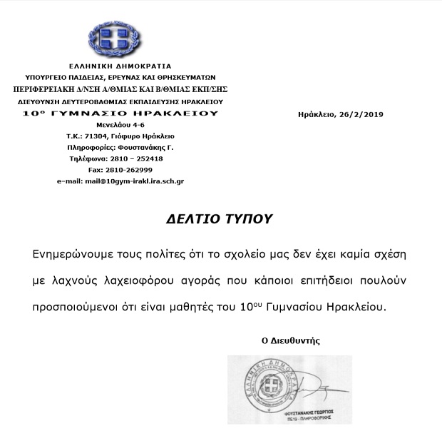 Καταγγελία για απάτη, με τη χρήση του ονόματος του σχολείου, κάνει ο διευθυντής του 10ου Γυμνασίου Ηρακλείου. Επιτήδειοι κάνουν τους μαθητές του σχολείου και πωλούν λαχνούς για λαχειοφόρο αγορά, αλλά αυτό δεν είναι παρά μια απάτη.