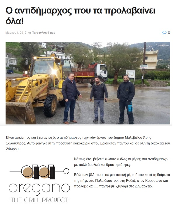 Με τον παραπάνω τρόπο διαφημίζεται συχνά εν’ όψει των δημοτικών εκλογών, ο “αεικίνητος” πανταχού παρών αντιδήμαρχος… παράλληλα με τον επίσης αεικίνητο πανταχού παρόντα δήμαρχο, που όλα τα ελέγχει και μπορεί να είναι ταυτόχρονα παντού, όπως ο μέντοράς τους Αυγενάκης…