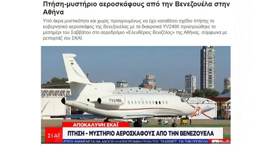 «Σύμφωνα με αποκλειστικό ρεπορτάζ του ΣΚΑΪ, κυβερνητικό αεροσκάφος της Βενεζουέλας προσγειώθηκε το Σάββατο στο αεροδρόμιο Ελευθέριος Βενιζέλος και παρέμεινε στην Αθήνα για 4 ώρες στη διάρκεια των οποίων ο ΥΠΕΞ της κυβέρνησης Μαδούρο έκανε κάποιες συναντήσεις.