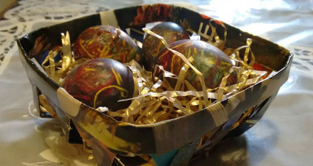 Στο εργαστήριο θα κατασκευαστεί ένα πλεκτό, εντυπωσιακό καλαθάκι από χαρτί περιοδικών, κατάλληλο για να στολίσουμε ή να προσφέρουμε τα πασχαλινά αυγά μας ή να αποθηκεύσουμε μεγάλα αντικείμενα. Οι συμμετέχοντες θα πρέπει να έχουν μαζί τους: