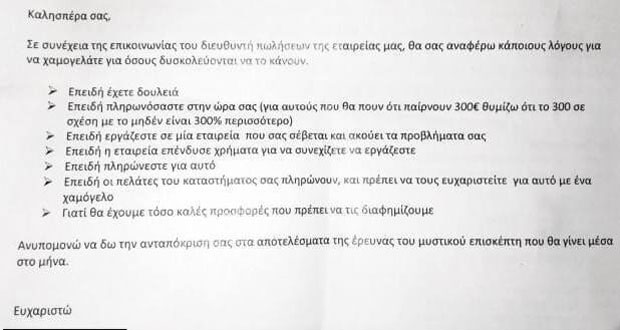 Στην πρωτοφανή τοποθέτηση, η διευθύντρια αναλύει στους εργαζόμενους τους λόγους για τους οποίους θα πρέπει να είναι μόνιμα χαμογελαστοί. Μεταξύ αυτών, σύμφωνα πάντα με την ίδια, είναι το γεγονός ότι απλώς και μόνο έχουν δουλειά και ότι πληρώνονται γι αυτήν – ακόμη κι αν παίρνουν μόνο 300 ευρώ – και μάλιστα στην ώρα τους, όπως επισημαίνει.