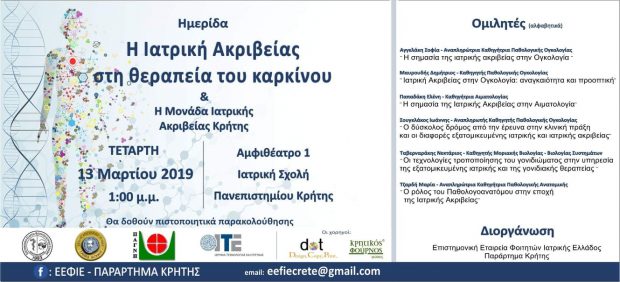 Την Τετάρτη 13 Μαρτίου 2019 και ώρα 1 μ.μ. το παράρτημα Κρήτης της Επιστημονικής Εταιρείας Φοιτητών Ιατρικής Ελλάδας διοργανώνει ημερίδα με τίτλο « Η Ιατρική Ακριβείας στη θεραπεία του καρκίνου και η μονάδα Ιατρικής Ακριβείας Κρήτης » στο αμφιθέατρο 1 της Ιατρικής Σχολής Ηρακλείου με ομιλητές (αλφαβητικά ) : Αγγελάκη Σοφία – Αναπληρώτρια Καθηγήτρια Παθολογικής Ογκολογίας , Μαυρουδής Δημήτριος – Καθηγητής Παθολογικής Ογκολογίας , Παπαδάκη Ελένη – Καθηγήτρια Αιματολογίας , Σουγκλάκος Ιωάννης – Αναπληρωτής Καθηγητής Παθολογικής Ογκολογίας , Ταβερναράκης Νεκτάριος – Καθηγητής Μοριακής Βιολογίας και Βιολογίας Συστημάτων, Τζαρδή Μαρία – Αναπληρώτρια Καθηγήτρια Παθολογικής Ανατομικής.