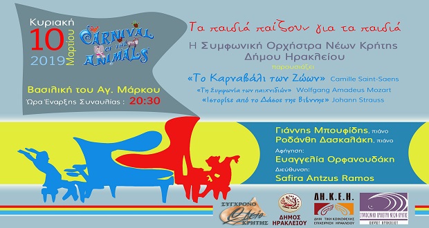 Η Συμφωνική Ορχήστρα Νέων Κρήτης του Δήμου Ηρακλείου θα πραγματοποιήσει συναυλία με τίτλο «τα παιδιά παίζουν για τα παιδιά», σήμερα Κυριακή 10/3/2019 στη Βασιλική του Αγίου Μάρκου στις 20:30, με ελεύθερη είσοδο για το κοινό.