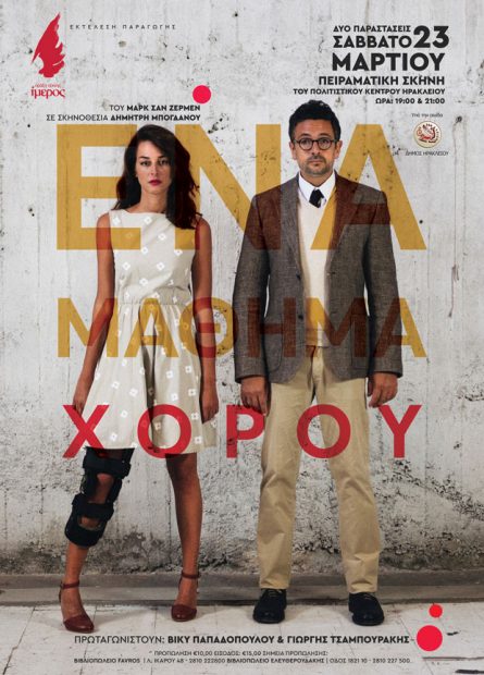 Η Πράξη Τέχνης Ίμερος υποδέχεται από την Αθήνα και τη Θεσσαλονίκη την επιτυχημένη θεατρική παράσταση “Ένα Μάθημα Χορού” με τη Βίκυ Παπαδοπούλου και τον Γιωργή Τσαμπουράκη. Η αυλαία της Πειραματικής Σκηνής του Πολιτιστικού Συνεδριακού Κέντρου Ηρακλείου θα ανοίξει το Σάββατο 23 Μαρτίου με διπλή παράσταση στις 19.00 και 21:00 .