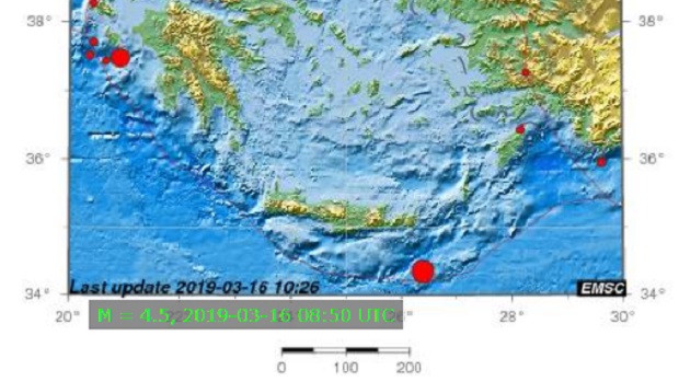 Σεισμική δόνηση 4,5 Ρίχτερ, σύμφωνα με το Ευρωμεσογειακό Σεισμολογικό Ινστιτούτο, καταγράφηκε νωρίτερα στην Κρήτη. Η δόνηση σημειώθηκε στα νοτιοανατολικά του νομού Λασιθίου στις 11.50 και είχε εστιακό βάθος 50 χιλιομέτρων.