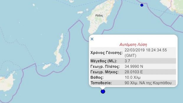 Σύμφωνα με την αυτόματη, προκαταρκτική λύση του Γεωδυναμικού Ινστιτούτου του Αστεροσκοπείου Αθηνών, υπολογίζει το μέγεθος του σεισμού σε 3,7 Ρίχτερ, ενώ το επίκεντρό του εντοπίζεται σε θαλάσσιο χώρο 90 χιλιόμετρα νοτιοανατολικά της Καρπάθου.