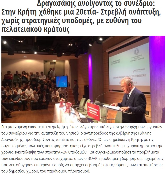 Ήταν το απόγευμα της 20ης Σεπτεμβρίου 2017, στην έναρξη του Περιφερειακού Συνεδρίου Κρήτης. Ο αντιπρόεδρος της κυβέρνησης, καλός γνώστης της πραγματικότητας στην Κρήτη, στην ουσία άνοιγε τις εργασίες με μια ομιλία που περιέγραφε ακριβώς ό,τι (δεν) είχε γίνει στο νησί στα χρόνια που κυριαρχούσαν ΠΑΣΟΚ και ΝΔ, κάνοντας λόγο για μια χαμένη εικοσαετία και παράλληλα δείχνοντας ξεκάθαρα τους υπεύθυνους.