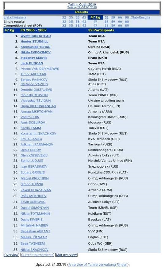 Ο Στέφανος Βαβίλης συμμετείχε στο μεγαλύτερο Διεθνές Τουρνουά Πάλης Νέων «2019 TALLINN OPEN – Kr. PALUSALU YOUTH WRESTLING TOURNAMENT» με τους 2.200 συμμετέχοντες αθλητές απ’ όλο τον κόσμο που πραγματοποιήθηκε το περασμένο Σαββατοκύριακο (29 & 30 Μαρτίου 2019), καταφέρνοντας τρεις εντυπωσιακές νίκες επί αθλητών από την Ρωσία, την Λετονία και την Λιθουανία και φτάνοντας στους 10 καλύτερους της κατηγορίας των 47kgr 2006-2007.